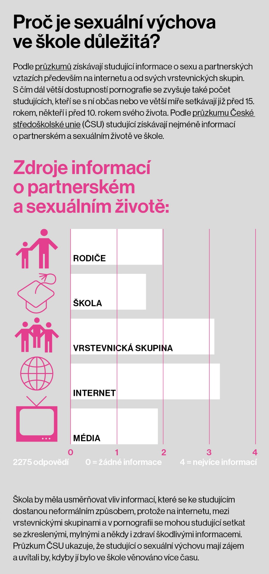 Infografiky představují přehledně a srozumitelně vybraná témata spojená s genderově citlivým vzděláváním. Zaměřují se například na genderově citlivý jazyk, maskulinitu, nestereotypní volbu povolání nebo sexualitu a genderovou identitu ve vzdělávání. Věnují se také otázkám sexuální výchovy, menstruace ve škole, genderu v tělesné výchově a sportu či problematice šikany a genderově podmíněného násilí ve školním prostředí.