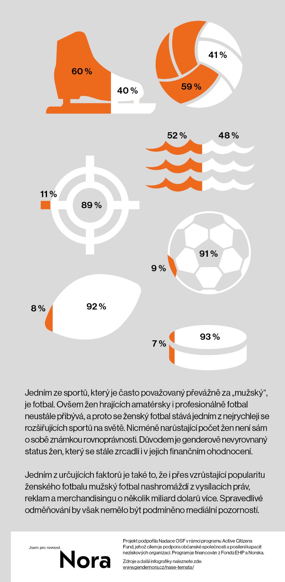 Infografiky přinášejí stručné a přehledné shrnutí vybraných témat, kterým se Genderové informační centrum NORA věnuje. Pomáhají srozumitelně představit výsledky výzkumů, klíčová data i praktická doporučení v oblasti genderové rovnosti.